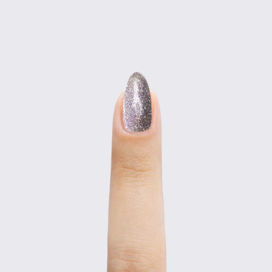 The metallic finish of this gunmetal-grey polish sets a shining example.